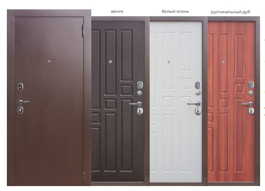Внешнее покрытие: атмосферостойкое порошковополимерное «медный антик» Внутреннее покрытие: фрезерованная МДФ-панель 6 мм, цвет - «венге», «белый ясень», «рустикальный дуб» Толщина дверного полотна: 60 мм Глубина дверного короба: 90 мм Наполнитель: пенополистирол Уплотнитель: 2 контура уплотнителя из вспененной резины Ручка: раздельная; цвет - хром Глазок: широкого обзора, цвет - хром Петли: 2 шт., наружные, открывание 180° Основной замок: цилиндровый RIGGER/MONARCH, диаметр ригелей: 14 мм Дополнительный замок: сувальдный RIGGER/MONARCH, диаметр ригелей: 14 мм Накладки: овальные с защитой от сквозняка; цвет - хром Независимая ночная задвижка Противосъём: штыри, 2 шт. Размеры: 860х2050 мм, 960х2050 мм
