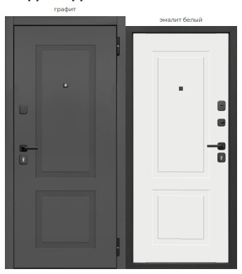 Внешнее покрытие: фрезерованная МДФ-панель 8 мм, цвет - «графит» Внутреннее покрытие: фрезерованная МДФ-панель 6 мм, цвет - «эмалит белый» Толщина дверного полотна: 75 мм Глубина дверного короба: 90 мм Наполнитель: пенополистирол Уплотнитель: 2 контура уплотнителя из вспененной резины Ручка: раздельная; цвет - черный Глазок: широкого обзора; цвет - черный Петли: 2 шт., наружные, открывание 180° Основной замок: цилиндровый KARAT/MONARCH, IV (наивысший) класс взломостойкости; диаметр ригелей: 16 мм Дополнительный замок: сувальдный KARAT/MONARCH, IV (наивысший) класс взломостойкости, дополнительная защита от высверливания: две пластины из высоколегированной стали с обеих сторон замка; диаметр ригелей: 16 мм Накладки: накладные декоративные; цвет - черный Независимая ночная задвижка Регулировка прижима притвора: металлический эксцентрик для защёлки на основном замке Противосъём: штыри, 2 шт. Размеры: 860х2050 мм, 960х2050 мм